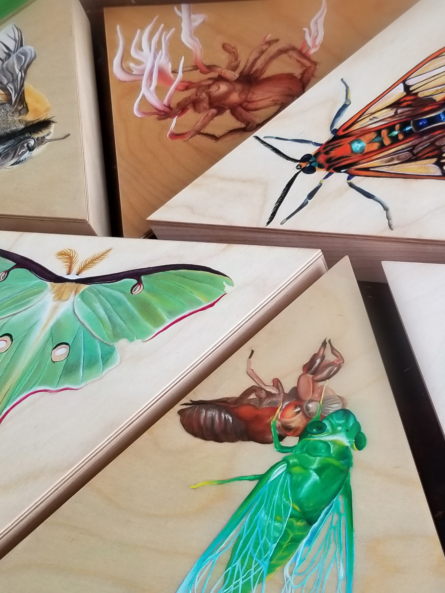 The Insect Tessellation series aims to bring attention to the often-overlooked members of the animal kingdom. As top predators, humans frequently disregard the importance of insects and arachnids, viewing them merely as pests. However, these organisms play a crucial role in our ecosystem. By presenting them on a much larger scale, this series invites viewers to appreciate the delicate and intricate anatomy of these tiny beings. The triangular panels of this series can be tessellated in infinite geometric arrangements, offering a dynamic and engaging visual experience.